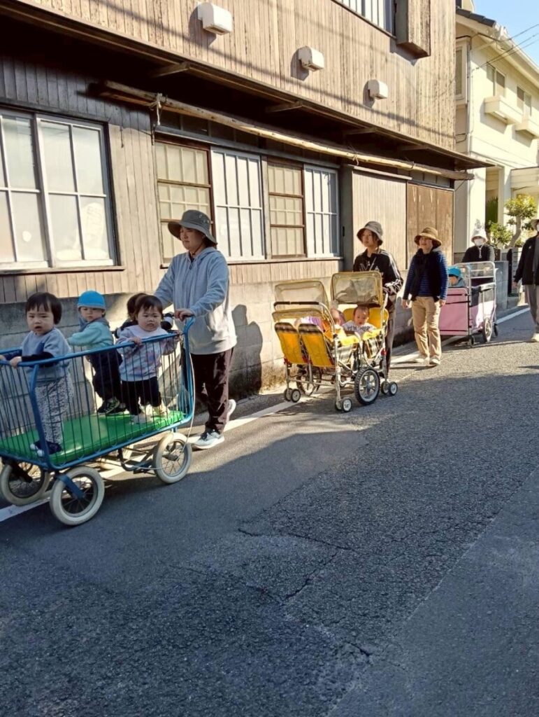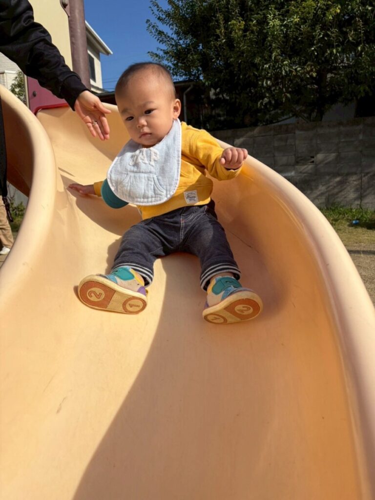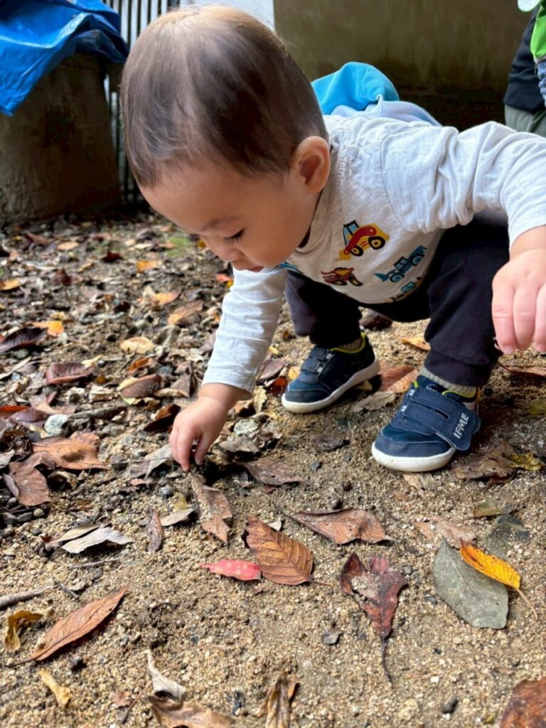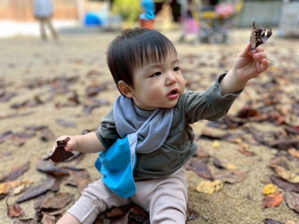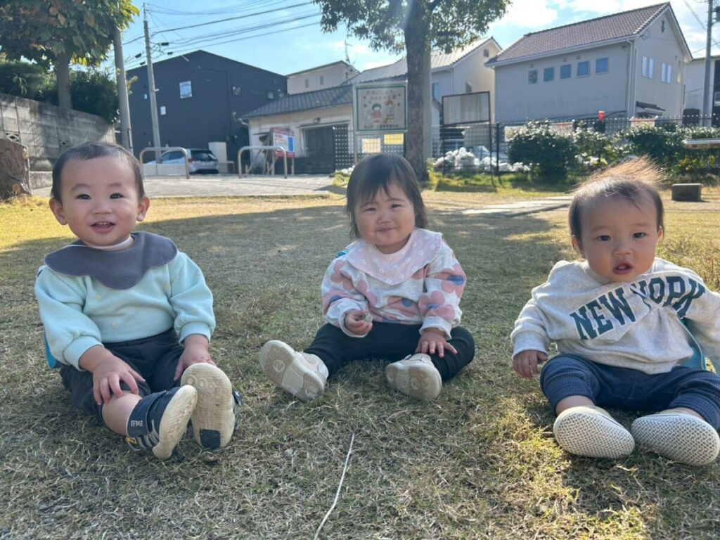 ハイハイや伝え歩きの子も公園内を保育士と散策したり、小さい滑り台を滑ったり、秋の自然に触れたりして過ごしています(^_^)
