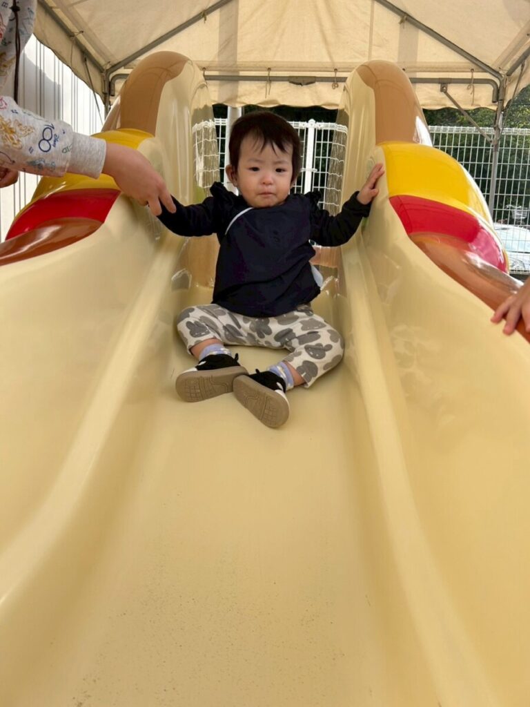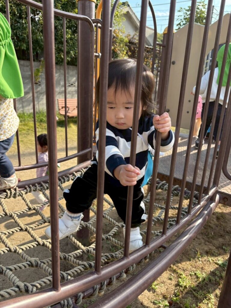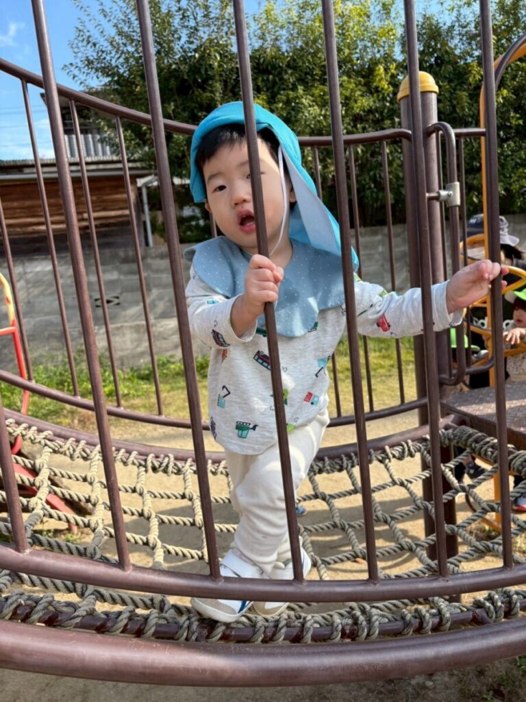 活動が活発になり、保育士が見守る中、怖がることなく1人で階段を上がろうとしたり、総合遊具のネット遊具を渡ろうとチャレンジしたり、自分で滑り台を滑ったりもしています!