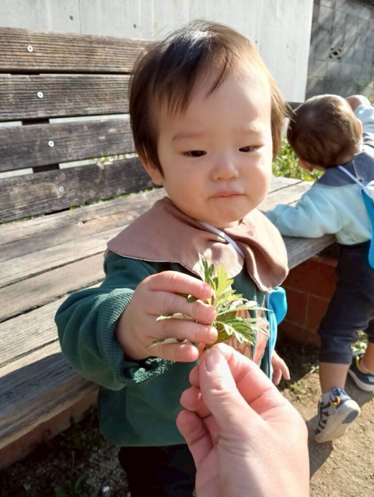 指先でどんぐりや葉っぱをつまんで保育士に見せてくれたり、片手に大事に持ってお散歩する子もいました♡
