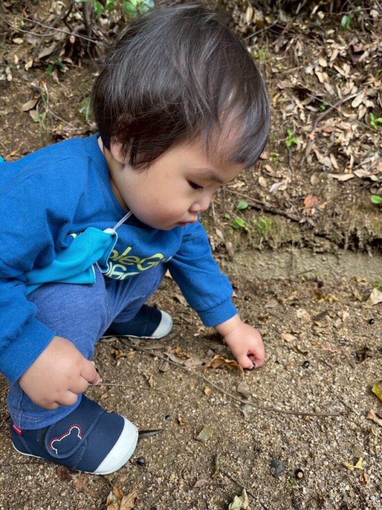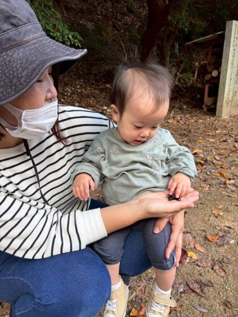 初めて三島神社に行った時よりも興味を持ってどんぐりや落ち葉や木のみを探しに行ったり、触れたりすることが増えました。