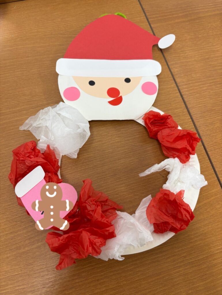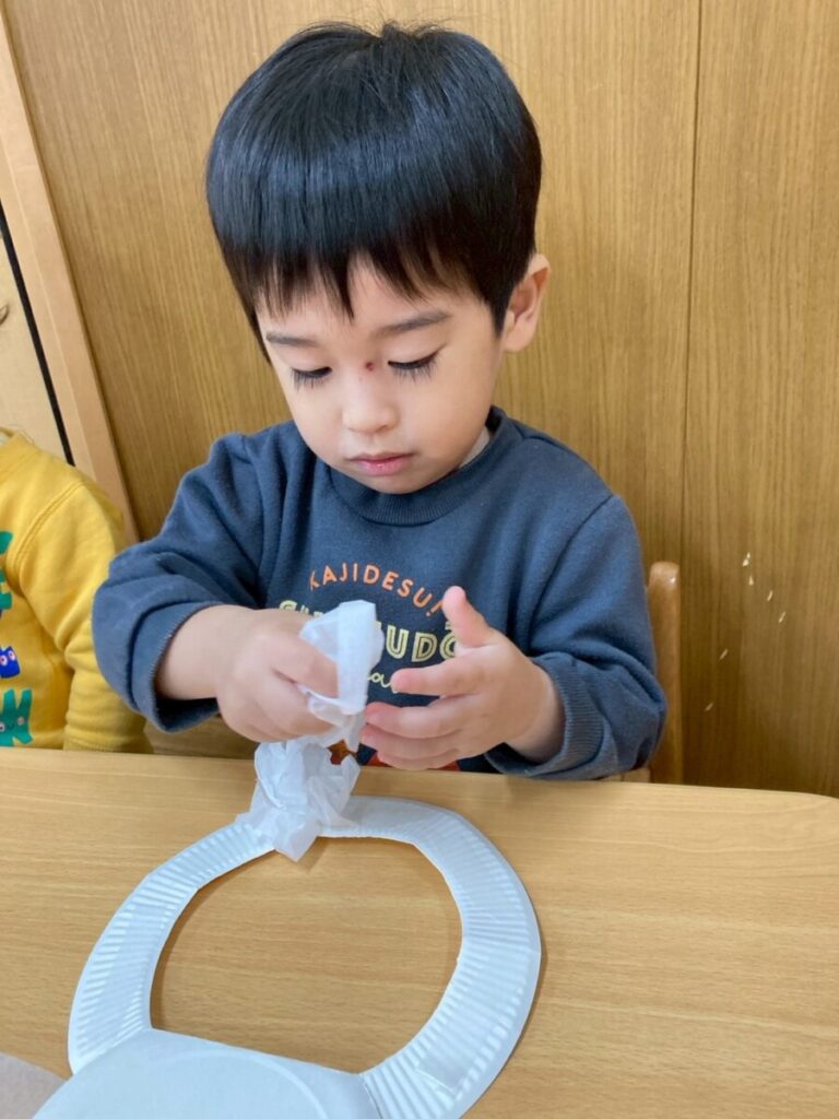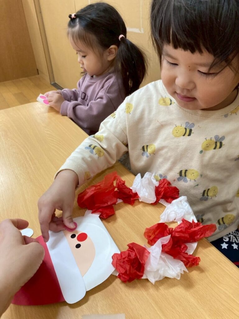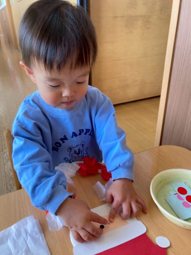 サンタさん🎅の土台に、赤と白の花紙をにぎにぎペッタン!