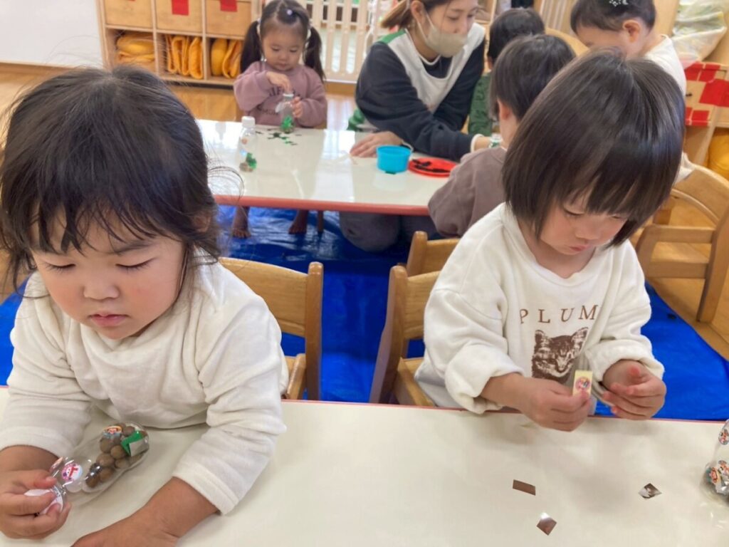 小さいどんぐりやキラキラの紙も指先で摘んで上手に入れられるよ!