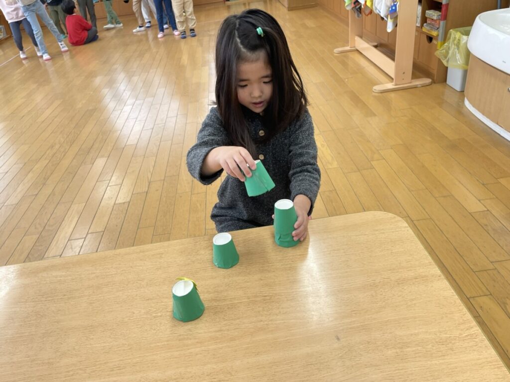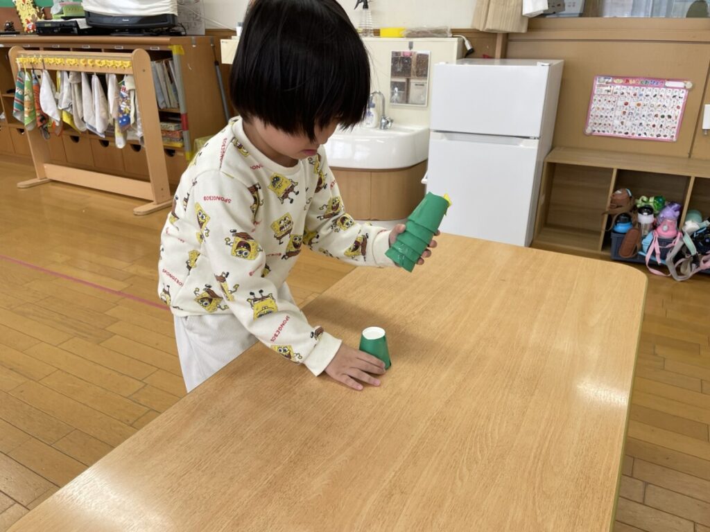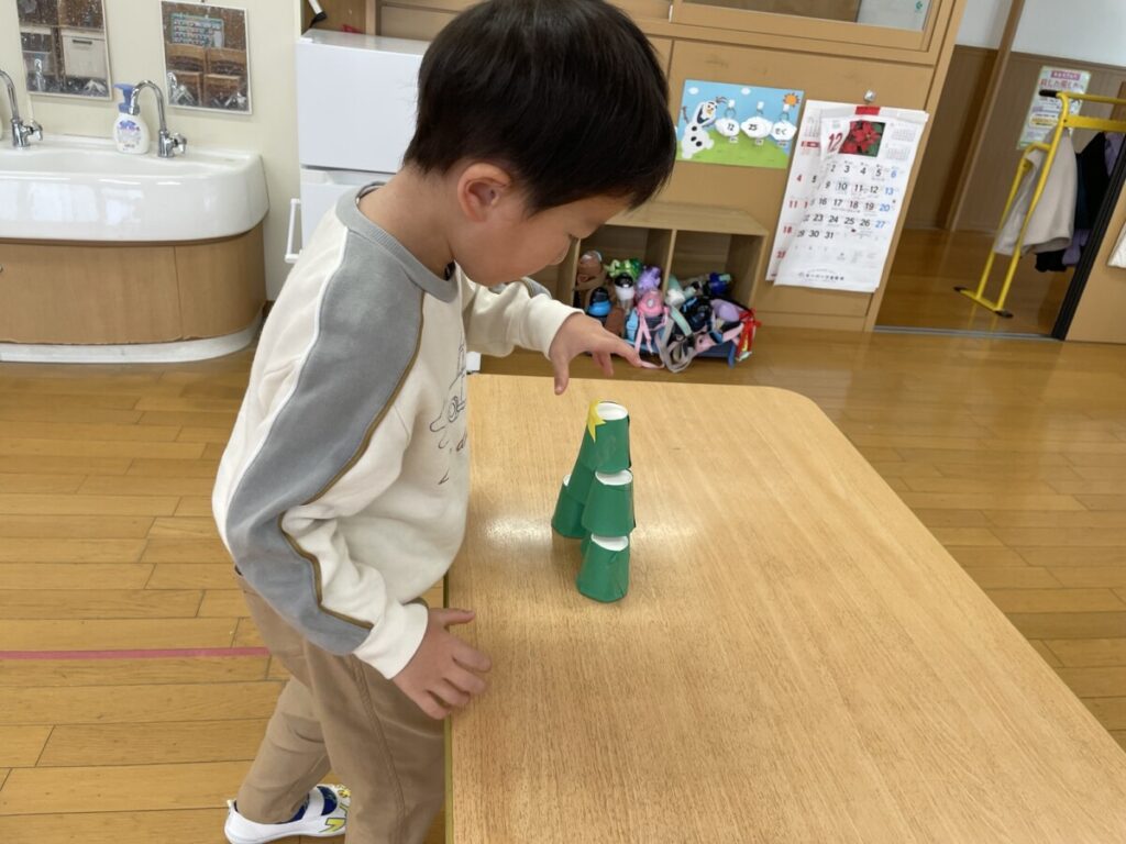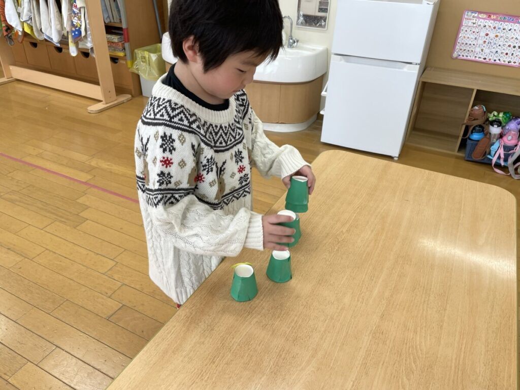クリスマスにちなんで、紙コップツリー競走をしました🎄