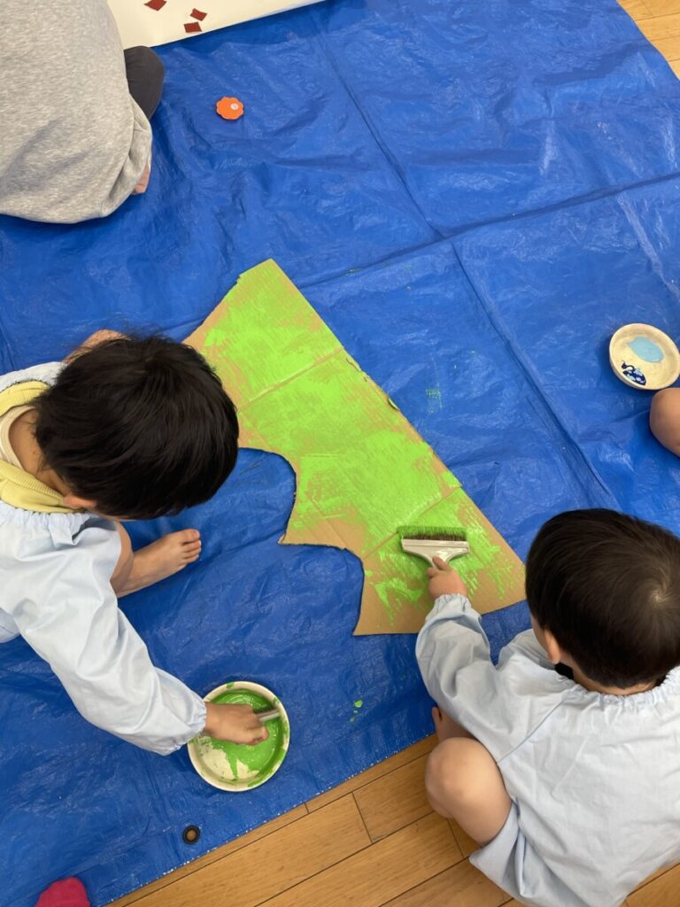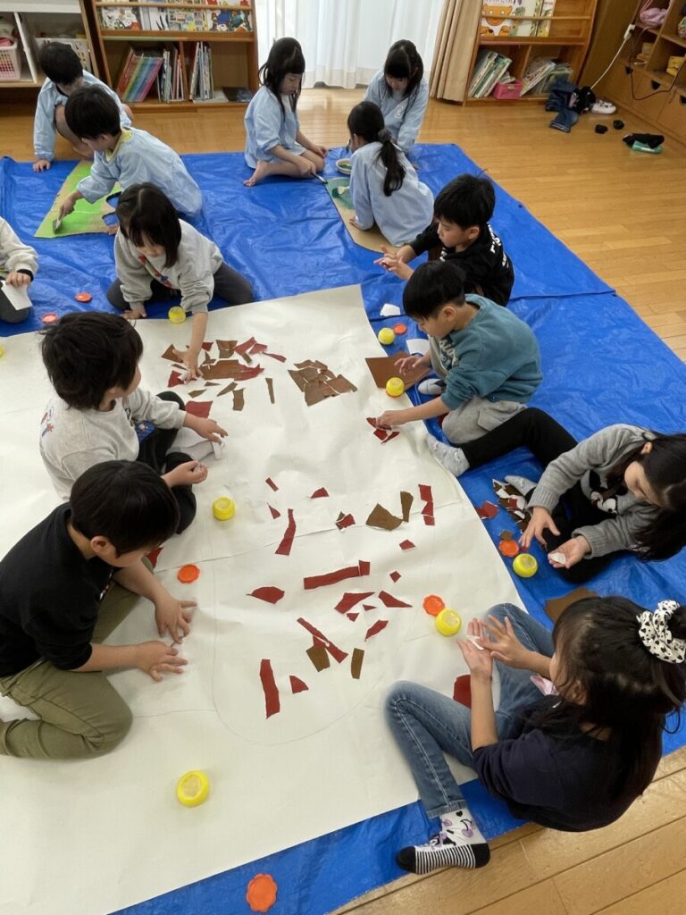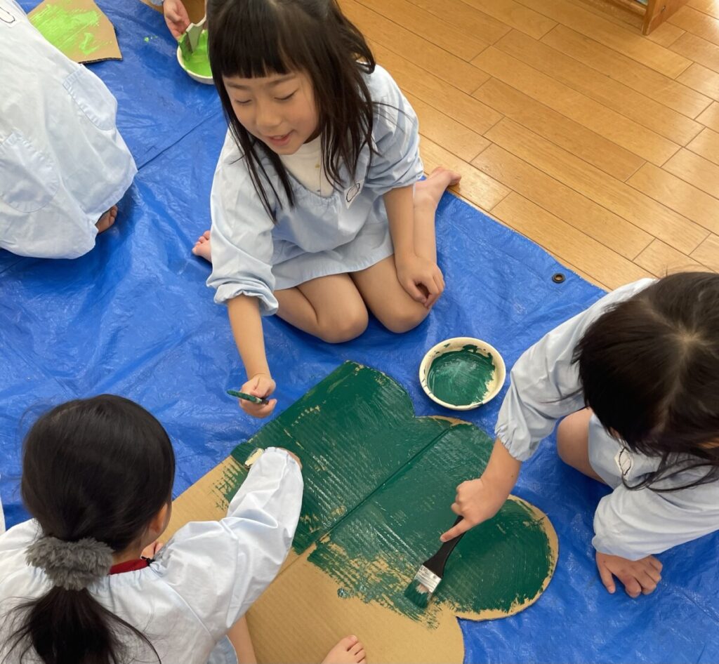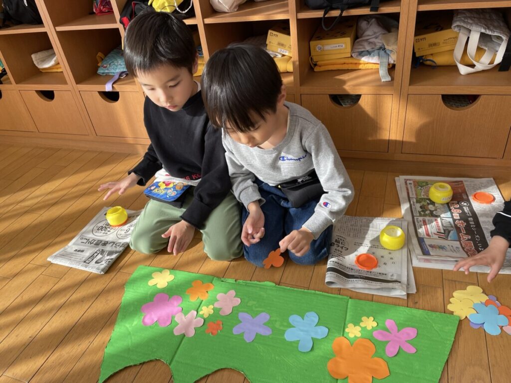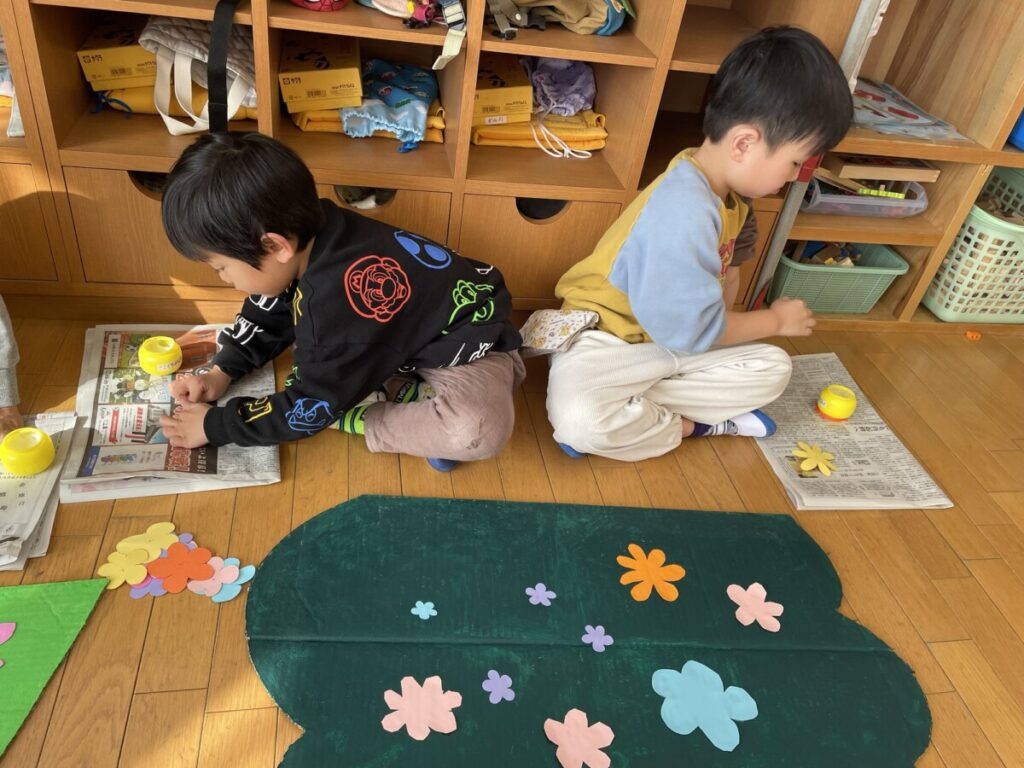 「森の中には、草とかお花とかもいるよね!」との声があり、可愛く仕上げていきました🌼