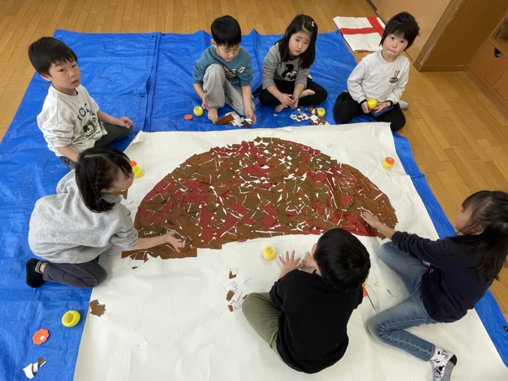 折り紙をちぎって、屋根部分を作りました!!