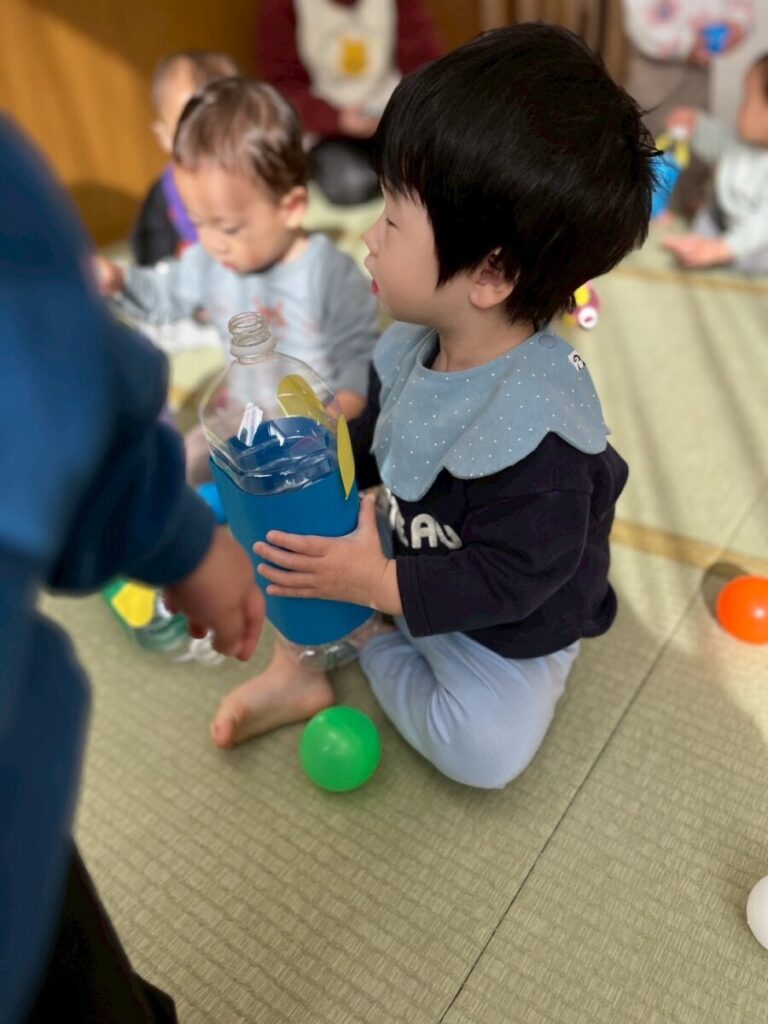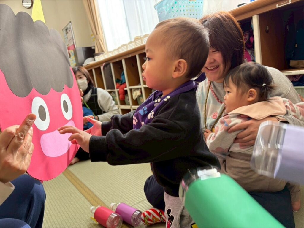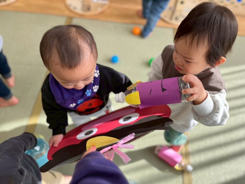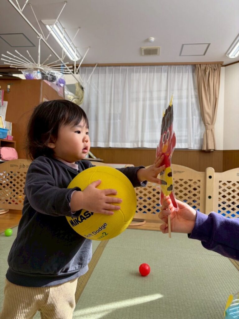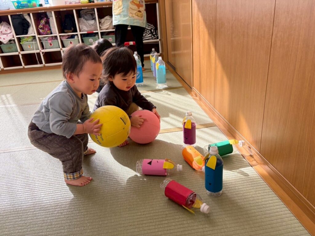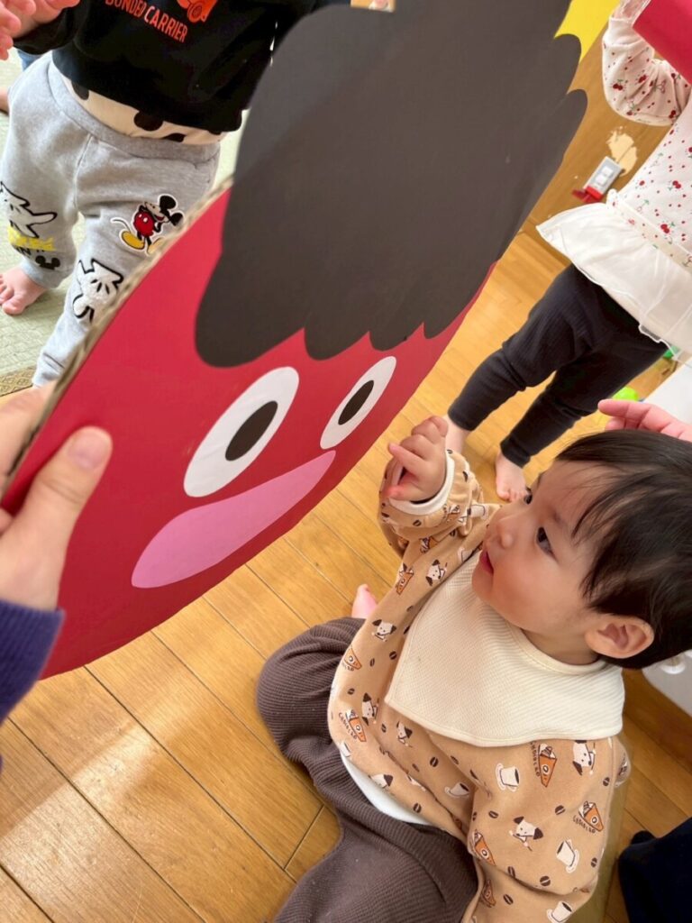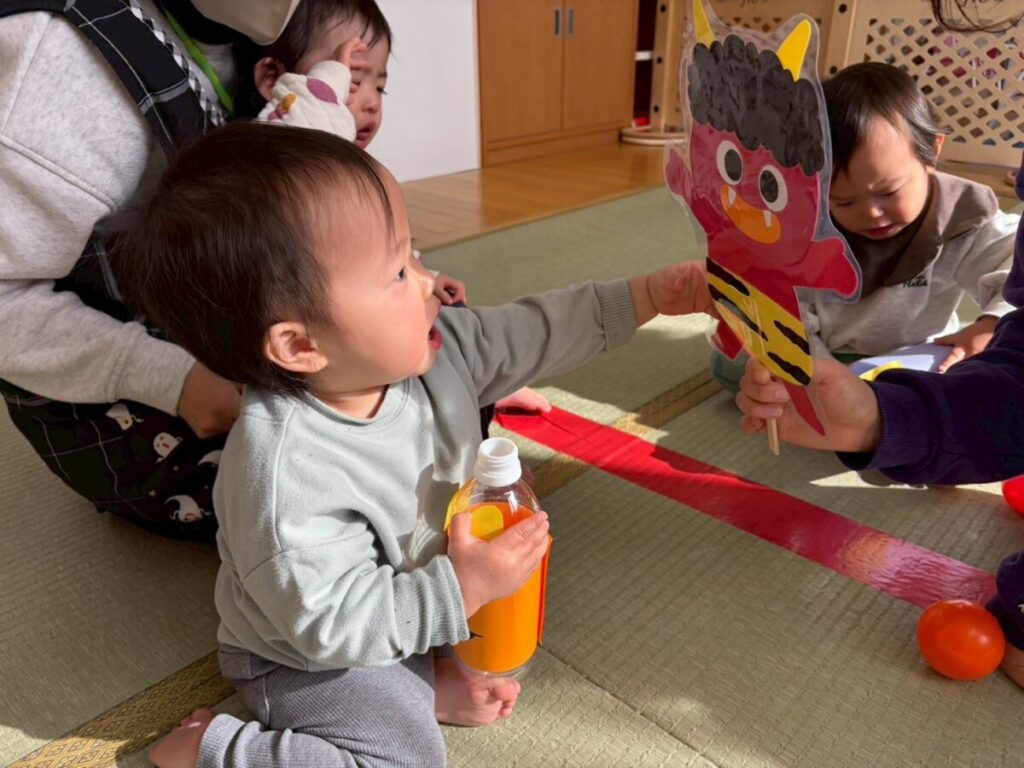 鬼のボーリングピンにも興味があるこもも組さん、手にとって「おに〜」と言えるお友達もいますよ✨