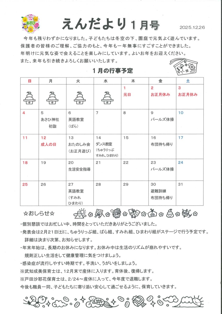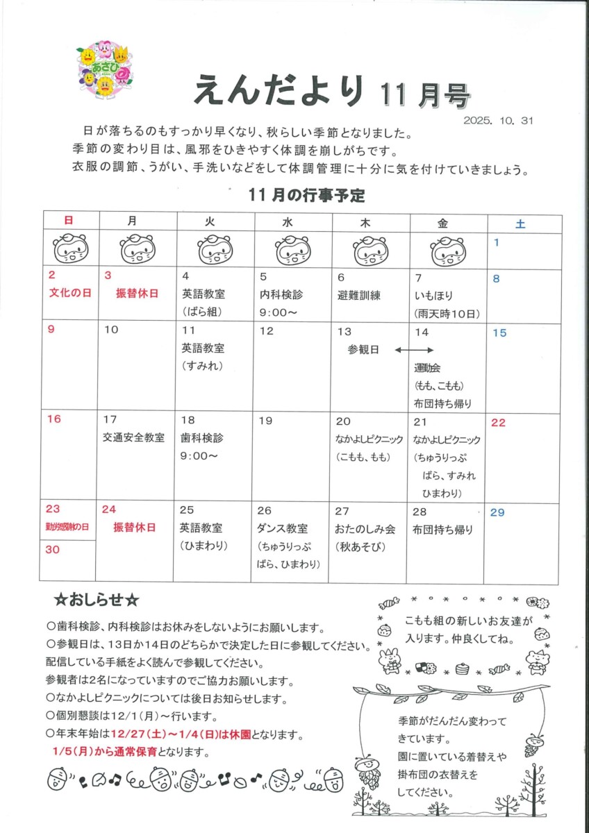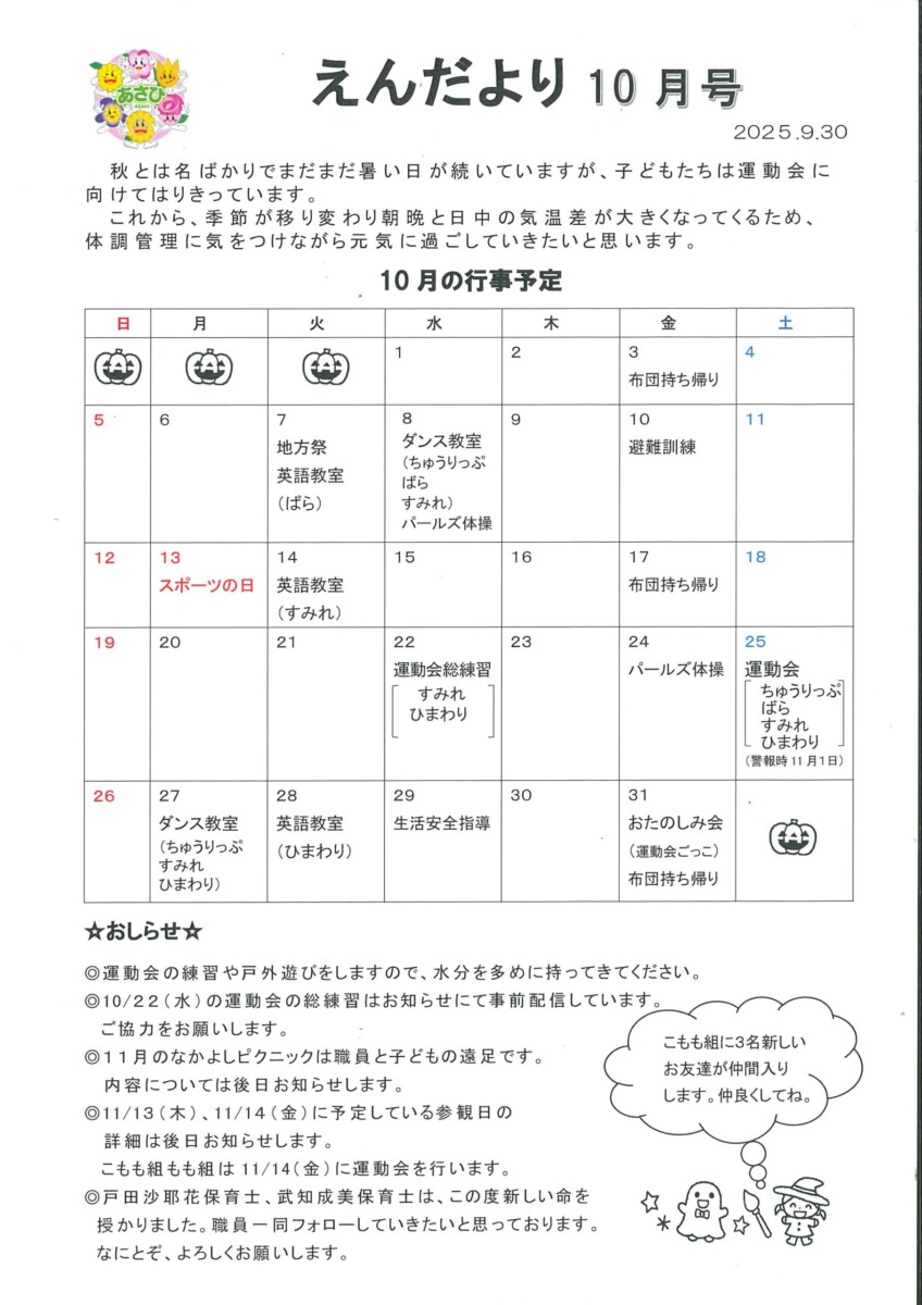 「来月はどんなことをするのかな?」「昼食はどんなメニューかな?」。ご家庭での予定をかんがえるときに、気になるものです。 月末に行事予定と献立表をお届けします。