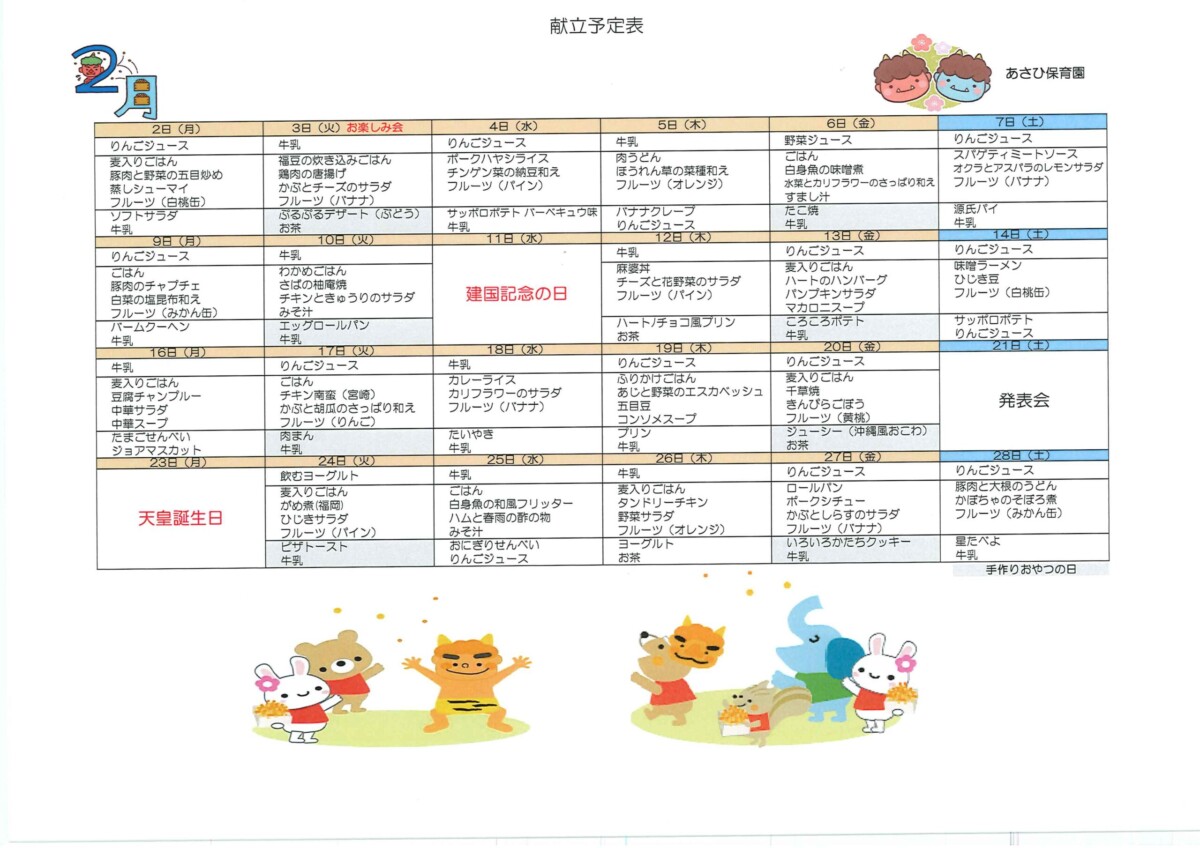 「来月はどんなことをするのかな?」「昼食はどんなメニューかな?」。ご家庭での予定をかんがえるときに、気になるものです。 月末に行事予定と献立表をお届けします。